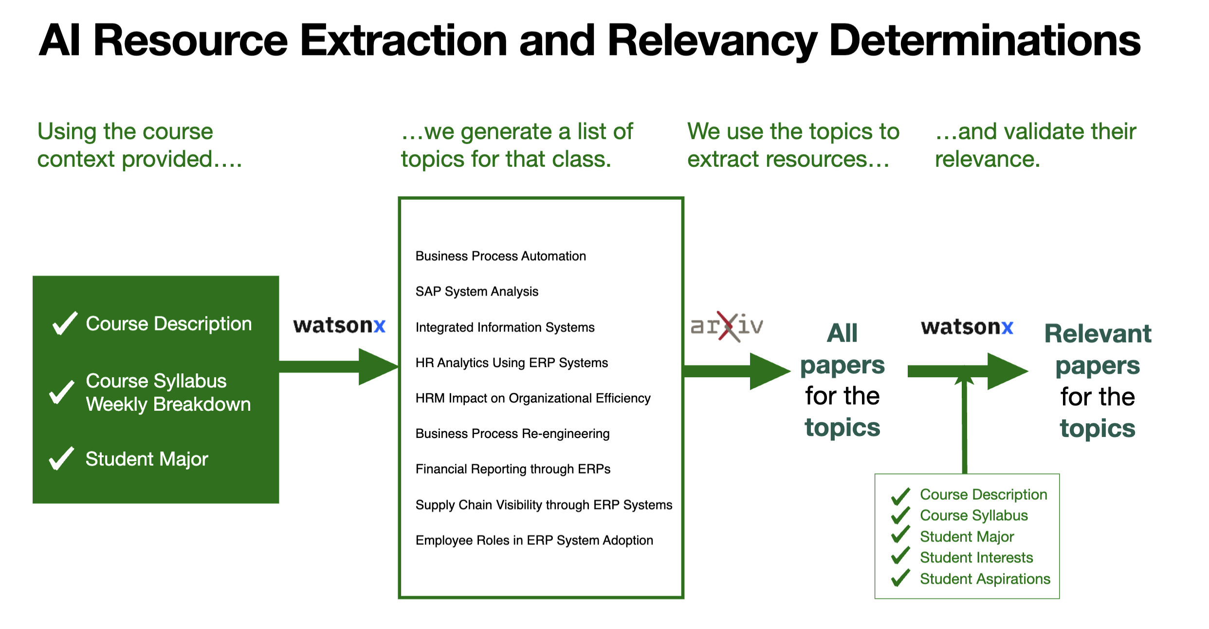 - AI Curation – The system uses IBM watsonx to generate a curated list of resources tailored to each student’s profile.